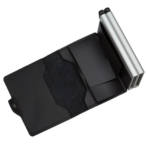 Das Twinwallet besteht aus 2 Cardprotectors. In jedem der beiden Cardprotectors kannst du 4 geprägte oder 6 ungeprägte Karten (also bis zu 12 insgesamt) unterbringen. Mit einer einfachen Betätigung des Hebelmechanismus lassen sich diese aufgefächert hinausschieben. Das geht auch ganz ohne das Portmonee zu öffnen. Der Cardprotector schützt deine Karten vor dem Auslesen (RFID-safe) und auch vor Beschädigungen.